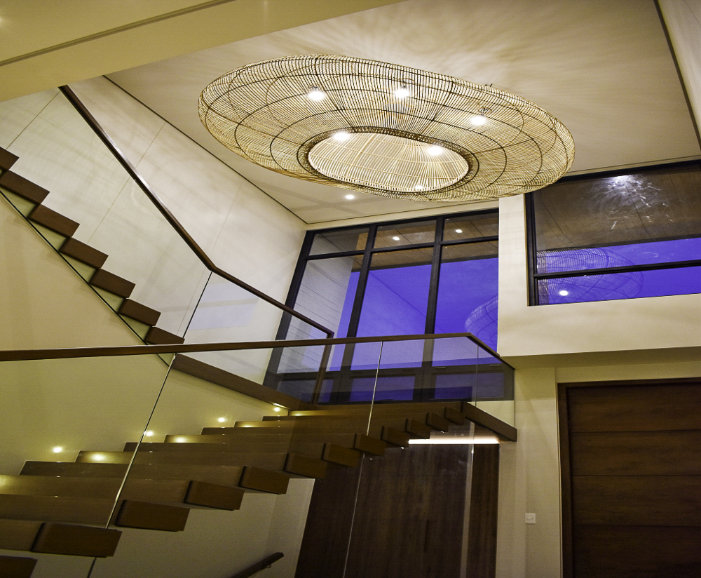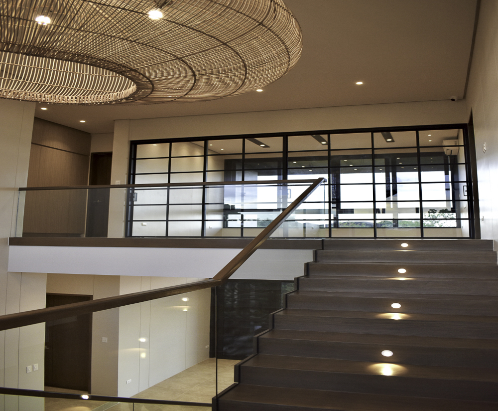 * Floating main stairs made of Antipolo wood with tempered glass baluster and Antipolo wood handrail
