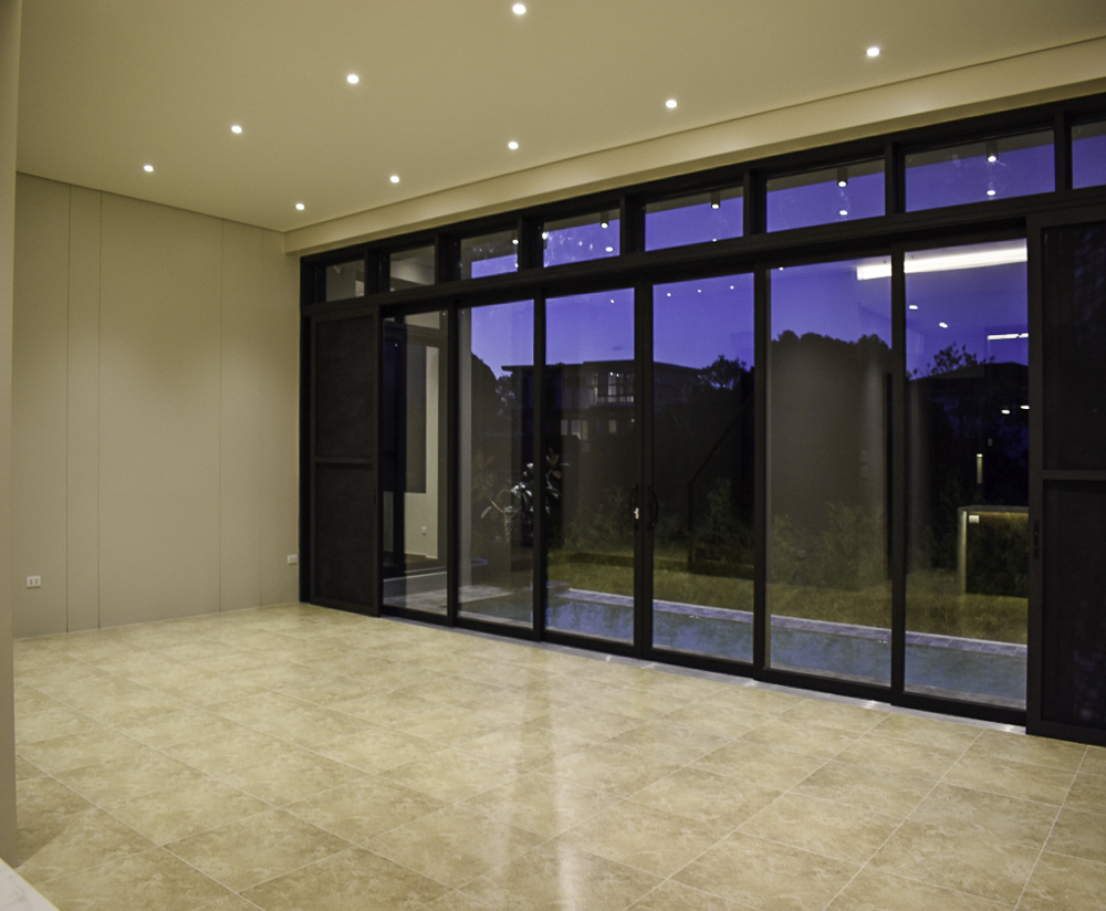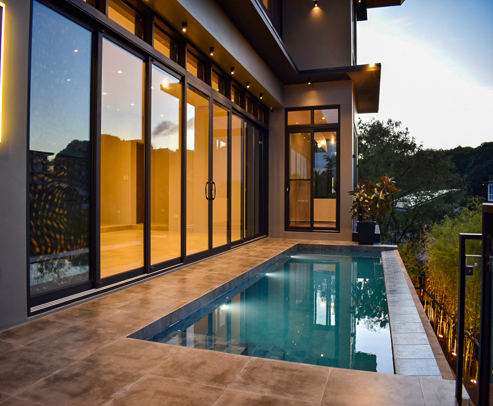 * Long span sliding door at Living & Dining opening to the swimming pool