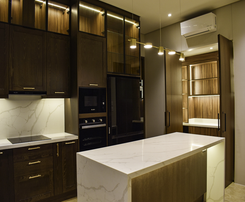 • Solid Ash Wood Shaker Design Doors with Bronze Tinted Glass and Calacatta Quartz Countertop for the Main Kitchen